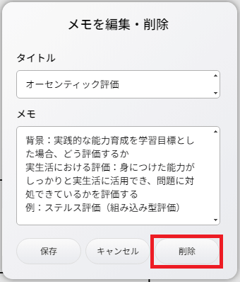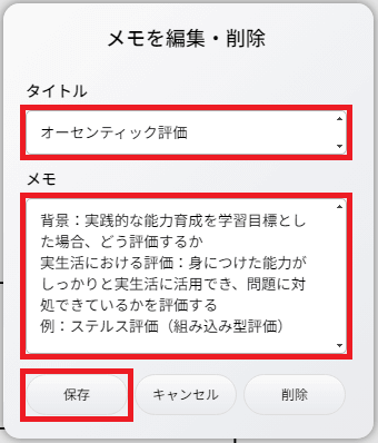 You can edit or delete the title or the content of the memo by clicking the “編集・削除/Edit/Delete”