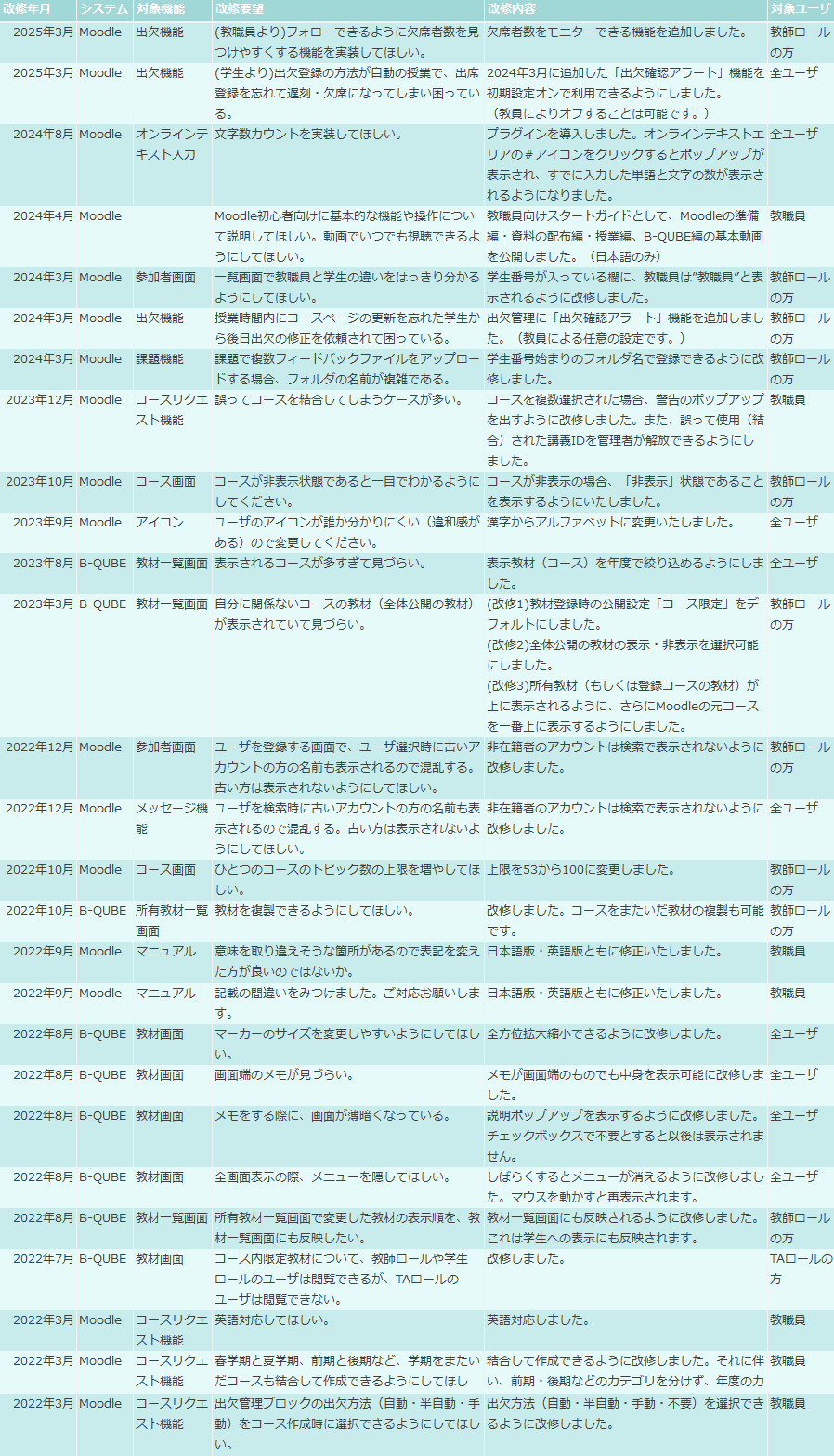 対象機能と改善内容一覧