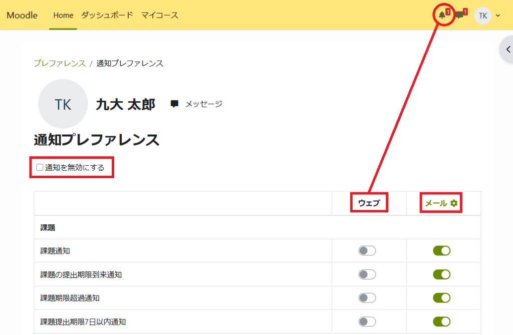 Moodleからの通知については、各項目ごとに通知を有効または無効に設定できます。